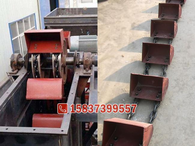 链条和链钩为高锰钢材质,经过热处理工艺,具有极高的抗拉强度和耐磨性能。料斗有中深斗、深斗两种类型,一般干燥的、易于抛出的物料可选用深斗,稍微潮湿物料、较难抛出物料可选用中深斗样式。