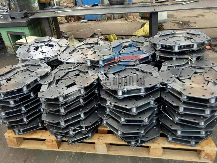 运行部件就是链条和料斗了,料斗挂载在链条上,链条随着链轮的转动一直循环运作,料斗在尾部箱体处进行装料,板链斗式提升机的进料方式为流入式,在头部箱体进行卸料,卸料方式为重力式卸料,从出料口排出。