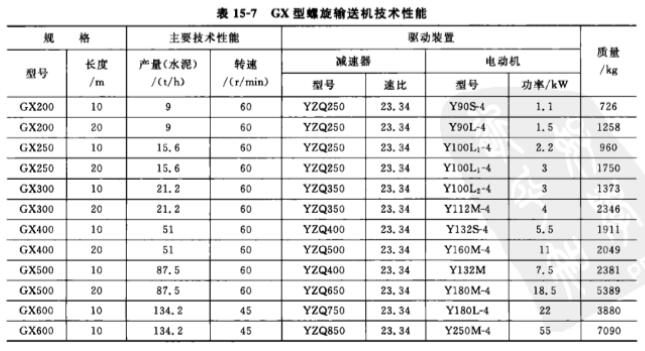 GX型螺旋输送机的螺旋直径有150mm、200mm、250mm、300mm、400mm、500mm和600mm共七种规格,机长3~70m,其级差为0.5m。可在环境温度为-20~50℃的条件下工作,以小于20°的倾角单向输送温度低于200℃的散状物料。GX型螺旋输送机是原机械工业部定型产品,整机可靠性高,寿命长,适应性强,安装维修方便。