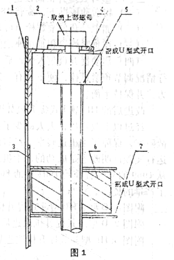 斗式提升机的尾部调节丝杆经常因粉尘和锈蚀螺母与丝杆难以相对转动,即使能相对转动,要将螺母与丝杆拧到全部脱开也相当困难,往往只能用气割将丝杆割断。针对上述问题,我们将固定角钢2和丝杆螺母固定框7分别加工成U字型开口,并加装卡板4,卡板与固定角钢用M12螺栓联接,这样拆卸调节丝杆十分简单,只要将卡板4拆下,整套丝杆即可一起拆出,旧丝杆清洗后与新件无异,以后新制作调节丝杆上部螺母可以去掉,减少加工量。详见图1。