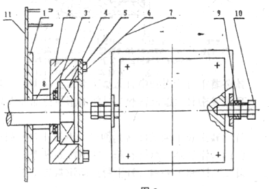 1.固定板;2.方型轴承座;3.骨架式油封;4.轴承5.闷盖;6.垫片;7蜾栓;8.耳板;9.止推螺母;10.轴承座固定螺栓;11调节滑板
